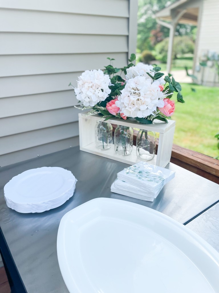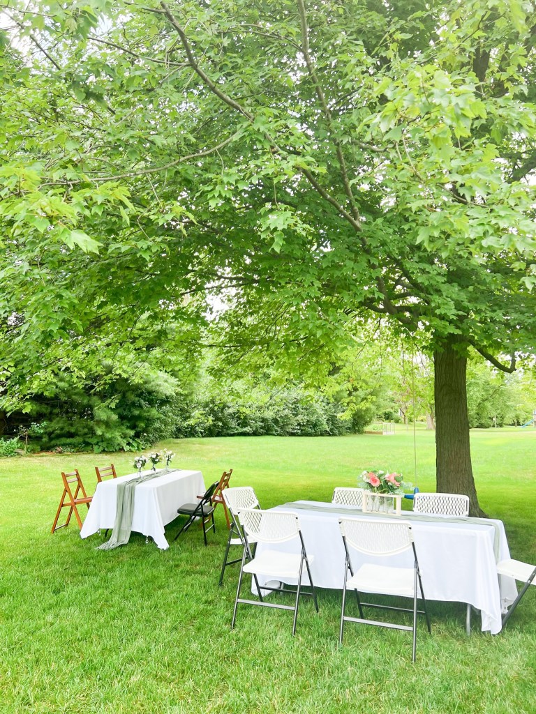 For seating I used 2 folding tables in the yard and decorated them with faux flower arrangements including a wooden and mason jar flower holder build. I placed a basic white table cloth with crystal tablecloth weight clips to keep it in place and a green gauzy cloth down the center.