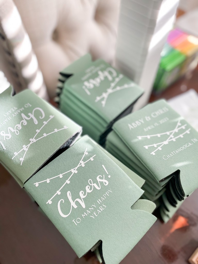 For drinks we had a keg of the grooms favorite beer, white cake, and water bottles. I made personalized can coolers to use with the drinks.