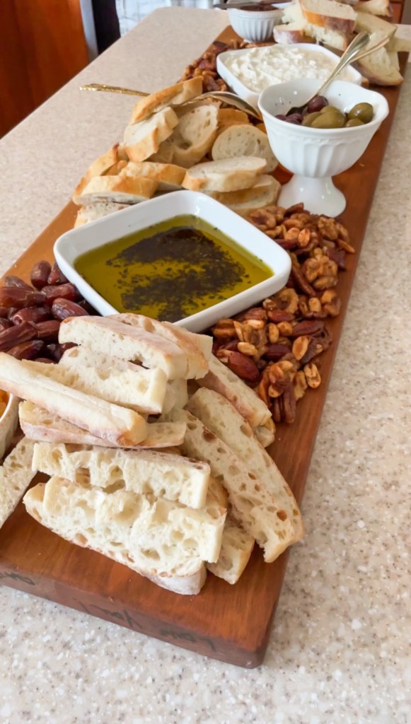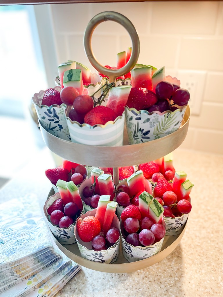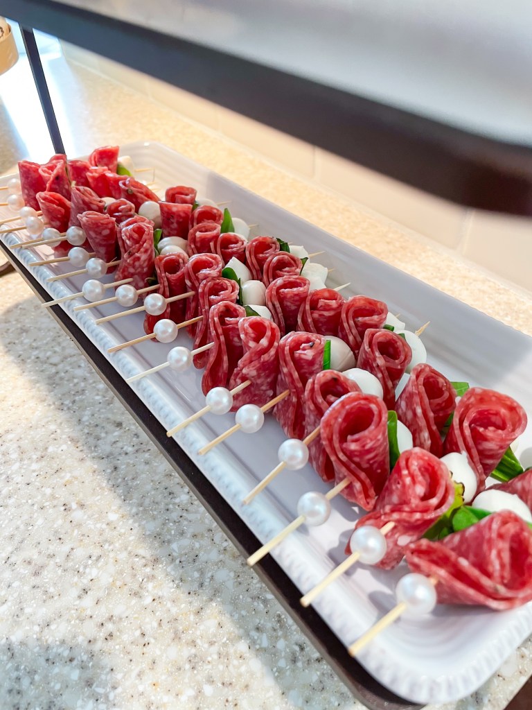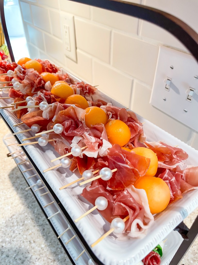 Inside I had a giant charcuterie board with breads, dips, nuts, dried fruit, and jams. I also made these super fun & easy fruit cups along with 2 cold skewers. For the skewers I did a melon & prosciutto skewer and a salami, mozzarella, and basil skewer. I found these amazing decorative skewers from Amazon and thought they added the perfect amount of elegance to the party!