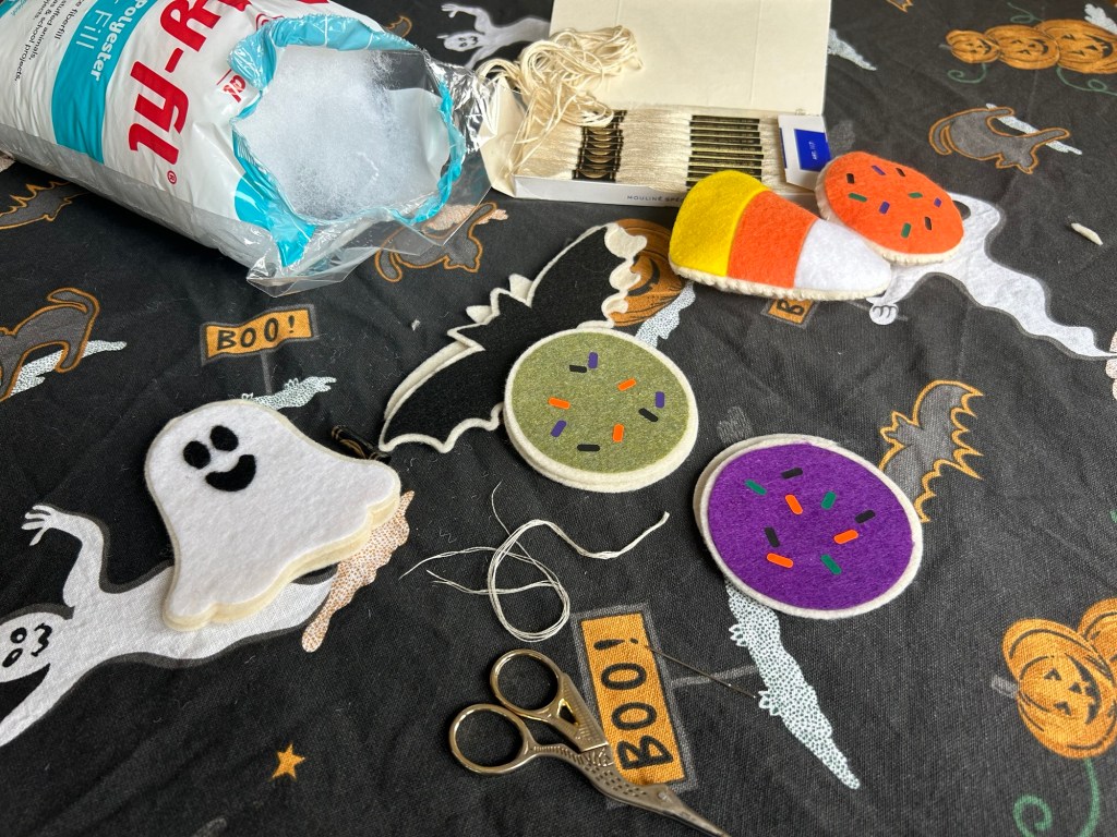 - Once all of the tops of the cookies are assembled, grab the base of the cookie in the same shape, and sew the cookie together three quarters around using a whip stitch with the cream embroidery thread.