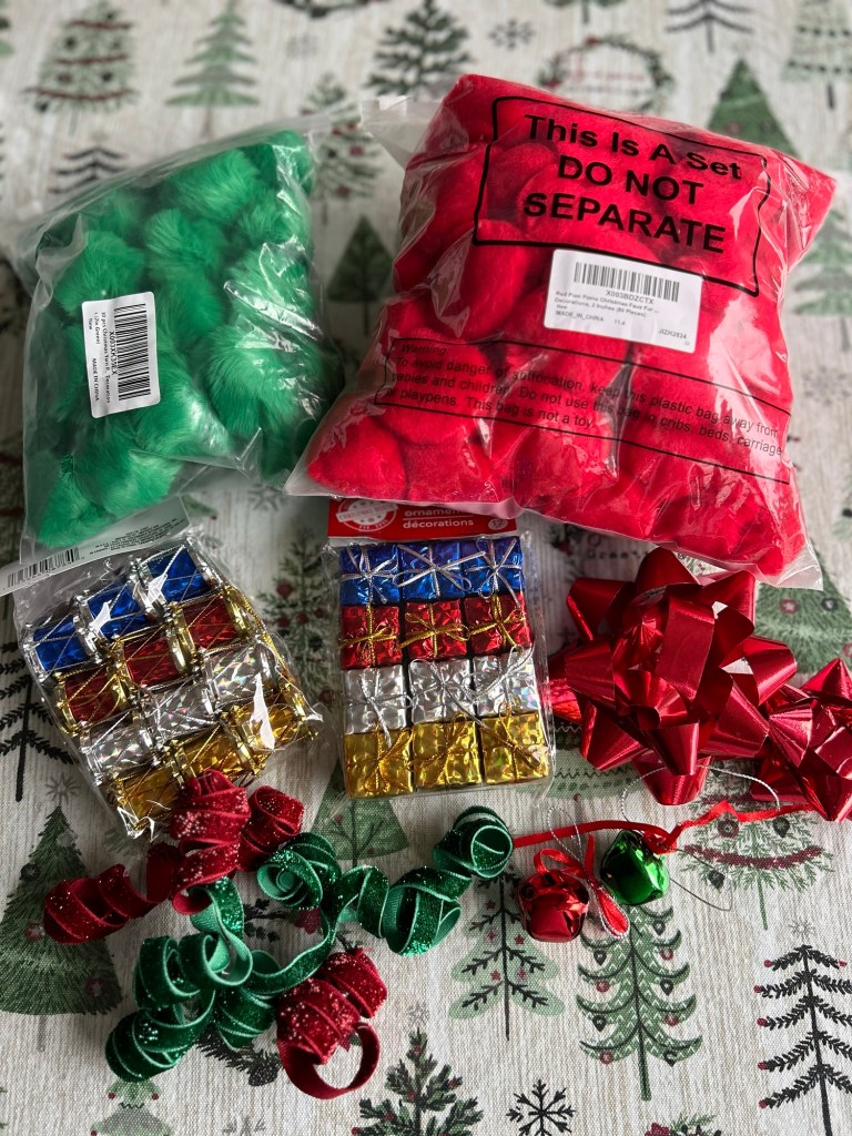 I used mini presents and drums, bows, bells, and pompoms to make a Christmas themed sensory bin. The ribbons and bows I had lying around with my wrapping supplies, the little metallic presents and drums are from the dollar store, and the green pompoms and red pompoms are from Amazon. I went for jumbo sized pompoms that are 2 inches in size because I didn’t trust the smaller ones around my daughter who still loves to put everything in her mouth. See a reel on Instagram of it all put together here