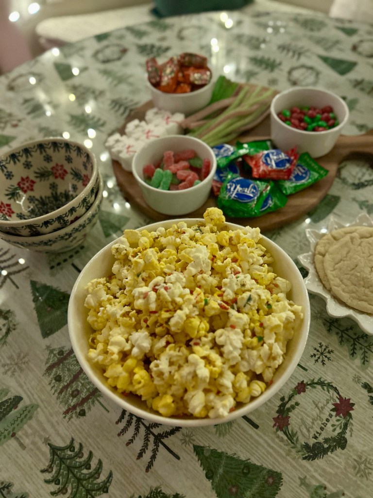 I’ve done candy boards before for my husband (the one on the left above is from his birthday a few years ago) so I thought I would do a Christmas candy themed one to make a movie night extra special. I got a variety of Christmas themed candies from the grocery and even added Christmas sprinkles to the popcorn for an extra touch.
