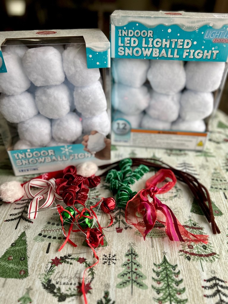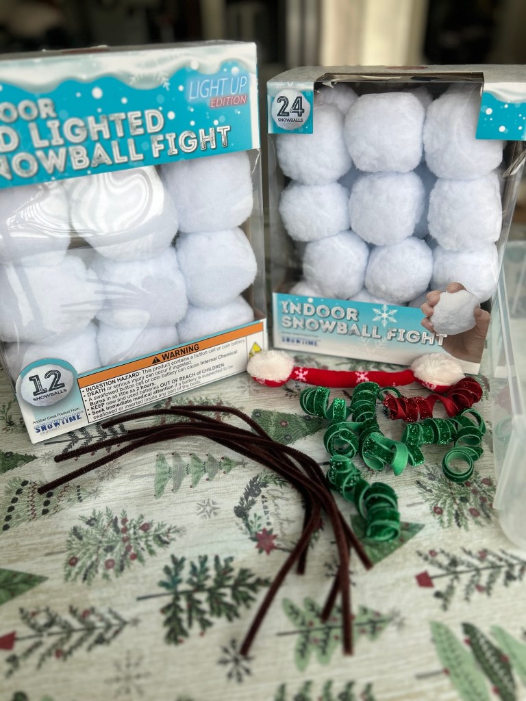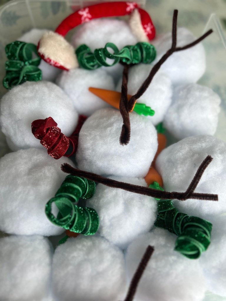 The idea behind this it that it’s all the components to make a snowman, just deconstructed. So there are the fake snowballs (classic and with LED lights), ribbons to symbolize scarves, pipe cleaners shaped to look like little stick arms, and my daughter has some little toy carrots from a Lovevery toy that I added as well for the carrot noses. This could have been done with cotton balls or fake snow you make at home, but I wanted this to last for multiple years so I opted to get the actual snowballs. I imagine they’ll get used in many different ways as my kiddos get older. I found mine at Marshalls but linked similar classic ones from Amazon. The LED light ones were considerable cheaper in store though so I suggest checking your HomeGoods and Marshalls stores to see if you can find them. Detailed supplies & shopping list 👇