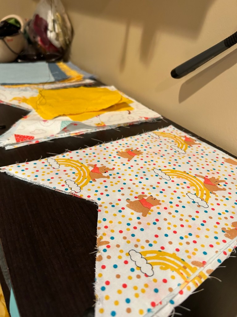 - Coordinating colored fabrics for the back in solids or mild patterns (I used blues and yellows with slight patterns from my fabric stash)
