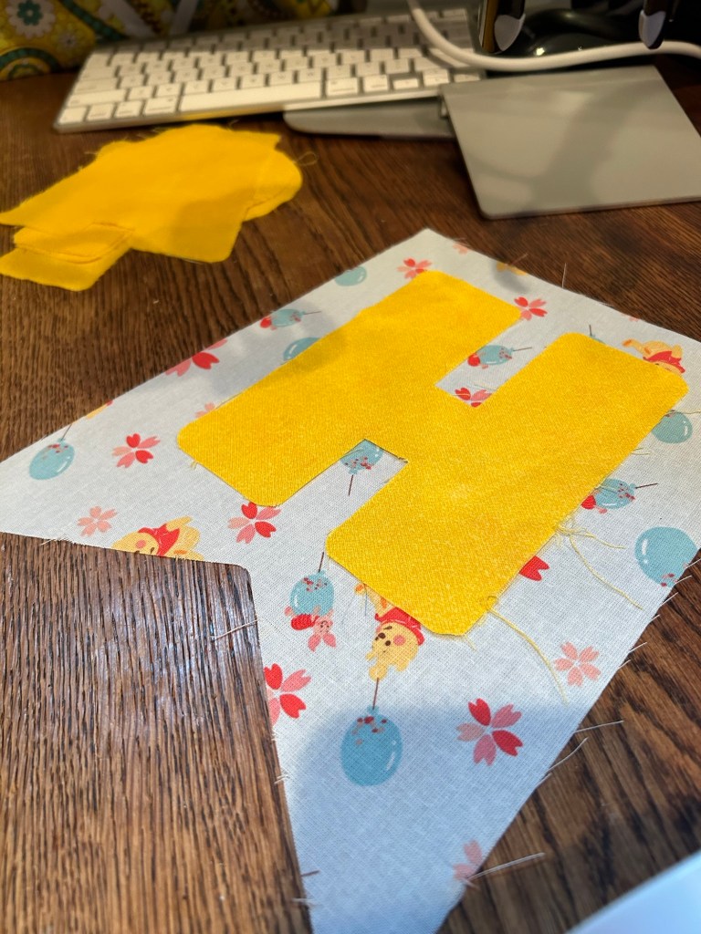 After all the pendants (front and back) and the letters are cut out you’ll want to attach the letters to the front fabric (the themed fabric).