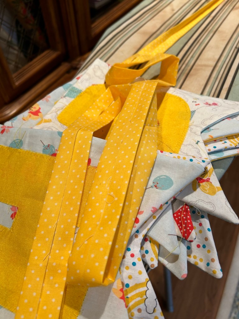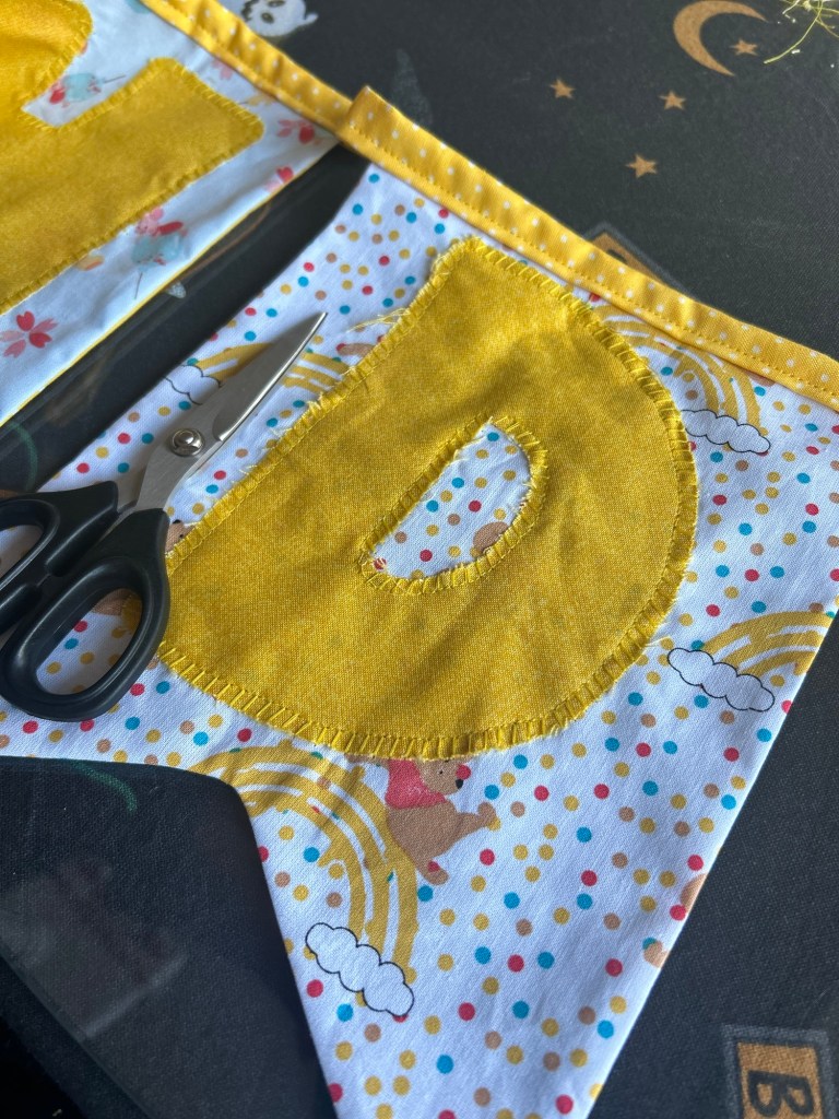 - Coordinating fabric for banner string (I chose a yellow with a mild pattern to complement the yellow letters)