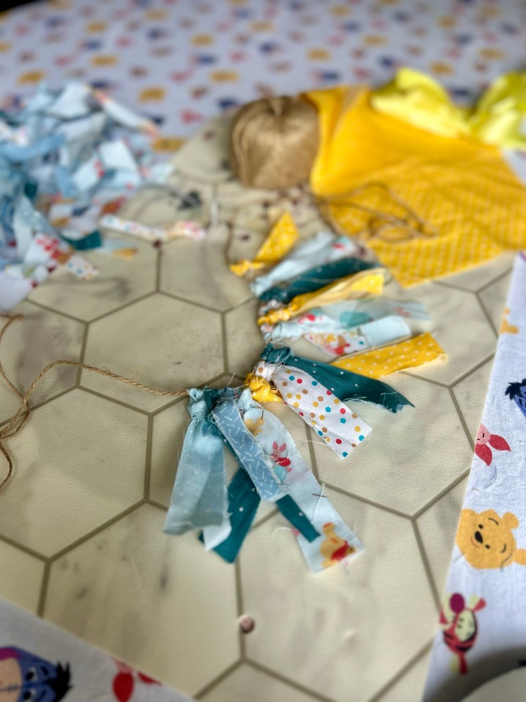 The process is as simple as you’d expect. You simply tie the fabric scraps onto a long piece of crafting twine. I used fabric pieces of varying lengths and widths to make it more rustic looking. I used a knot almost like you’re tying a neck tie. Just drape the fabric scrap over the twine and keeping wrong sides of fabric together bring it around in a loop at then pull through the top. If you prefer a visual you can see me tying it in my IG reel here.