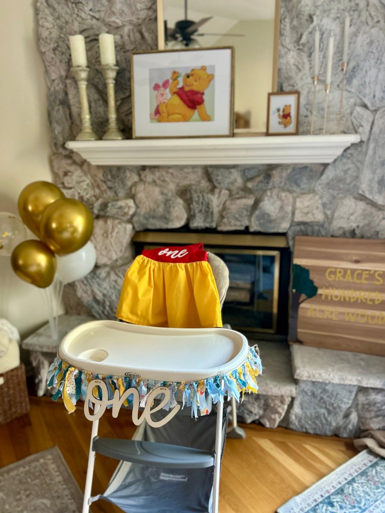 I’m finally getting around to sharing all of the projects I made for my daughter’s Winnie the Pooh 1st birthday party! I wanted the majority of the decorations to be homemade and I wanted them to be reusable- either for a future party or as decor in her future big girl room. I definitely needed to find a way to dress up her high chair because I figured many of the photos of the day would be taken with her sitting in it as she went to town on her smash cake.