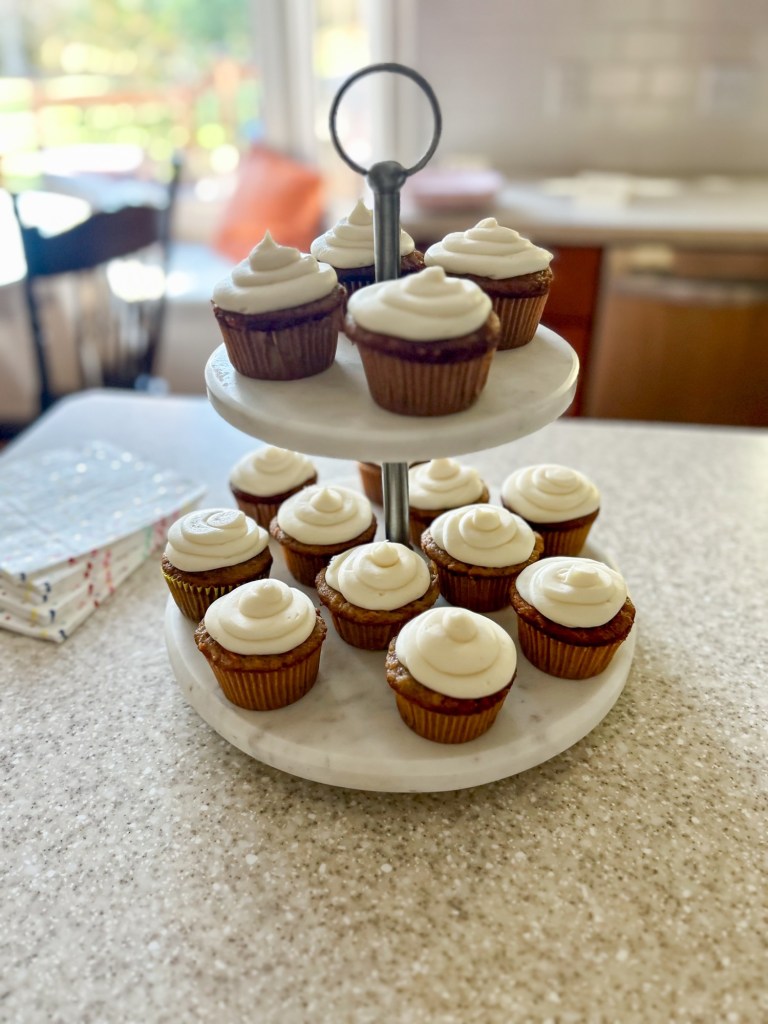 Since I didn’t think any of the guests was going to want to eat the smash cake after my daughter went at it, I made cupcakes for the rest of us. I went with carrot cake cupcakes and cream cheese frosting in part because it’s just one of my favorite receipts, and also I thought the carrots tied in well with something from Rabbit’s garden.