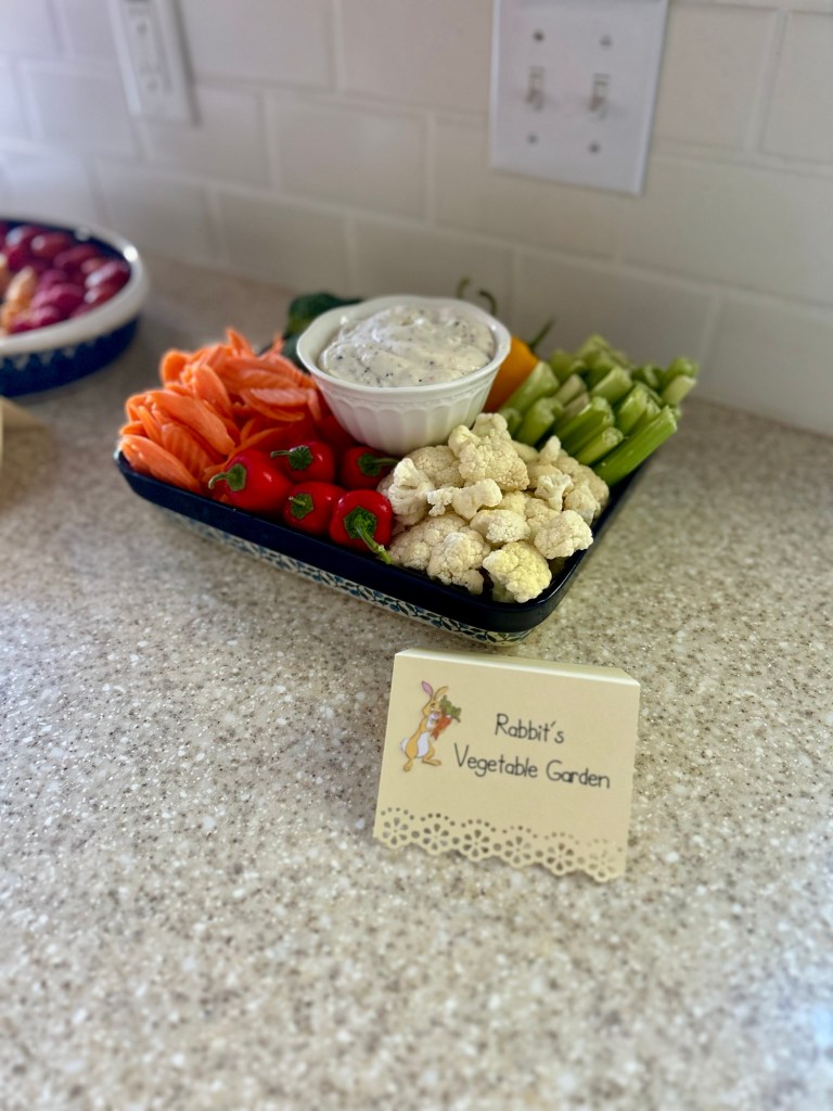 I just grabbed a veggie tray from Costco and the morning of the party transferred it to a pretty platter for display.