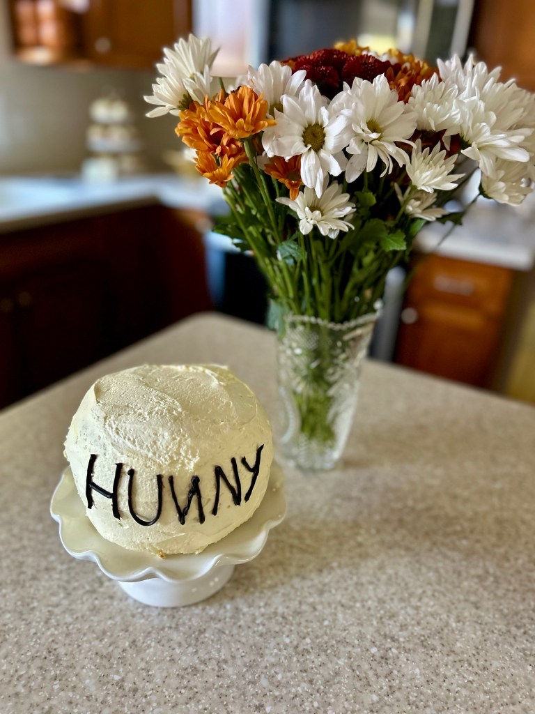 I made a banana cake for my daughter’s smash cake since she loves banana and I wanted something with less sugar than a traditional cake. I used this recipe for the cake (but not the icing). For the icing I wanted something that would be tinted yellow without using any artificial food coloring because I didn’t want to deal with it staining. I used this recipe for cool whip frosting and used vanilla pudding which gave it the very slight yellow color which I thought worked perfectly for the honey pot. For a smash cake I recommend halving both of the recipes as you don’t need a full sized cake. I baked the cake in two 6-inch round cake pans and then carved the cake just taking a little bit off the top and bottom to round the shape out. The best part about this design is it is meant to be rustic so you don’t have to have much in the way of decorating skills and it will still look great.