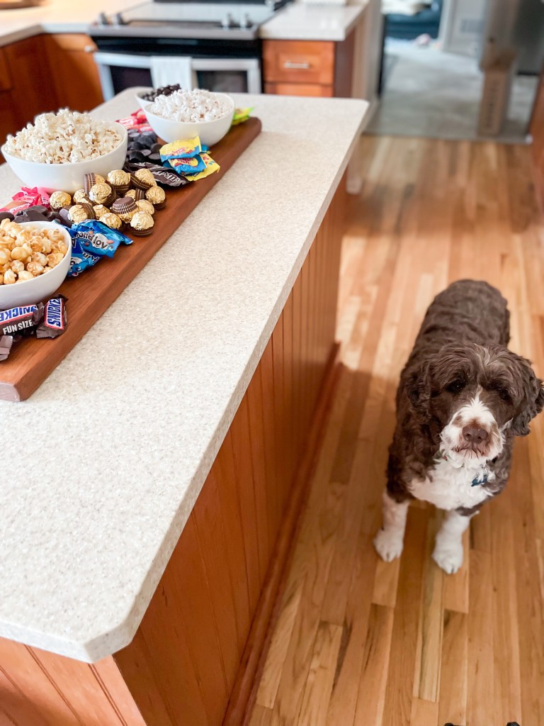 My pups are also MAJOR popcorn lovers so this one was underfoot the whole time I was assembling the board, hoping I would drop a piece.