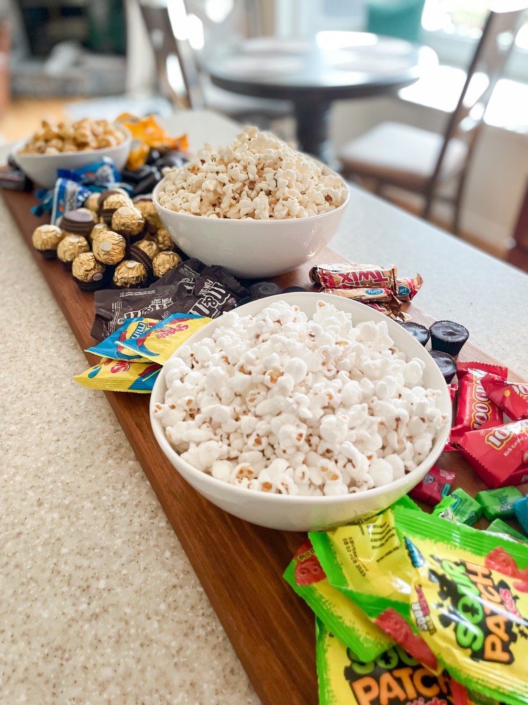 I wanted to make movie night extra special for his birthday this year so I whipped up a board full of candy and popcorn to add to the fun and festivities.