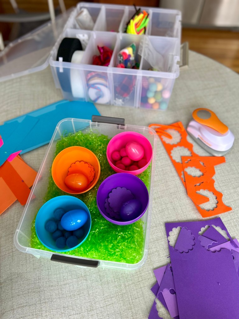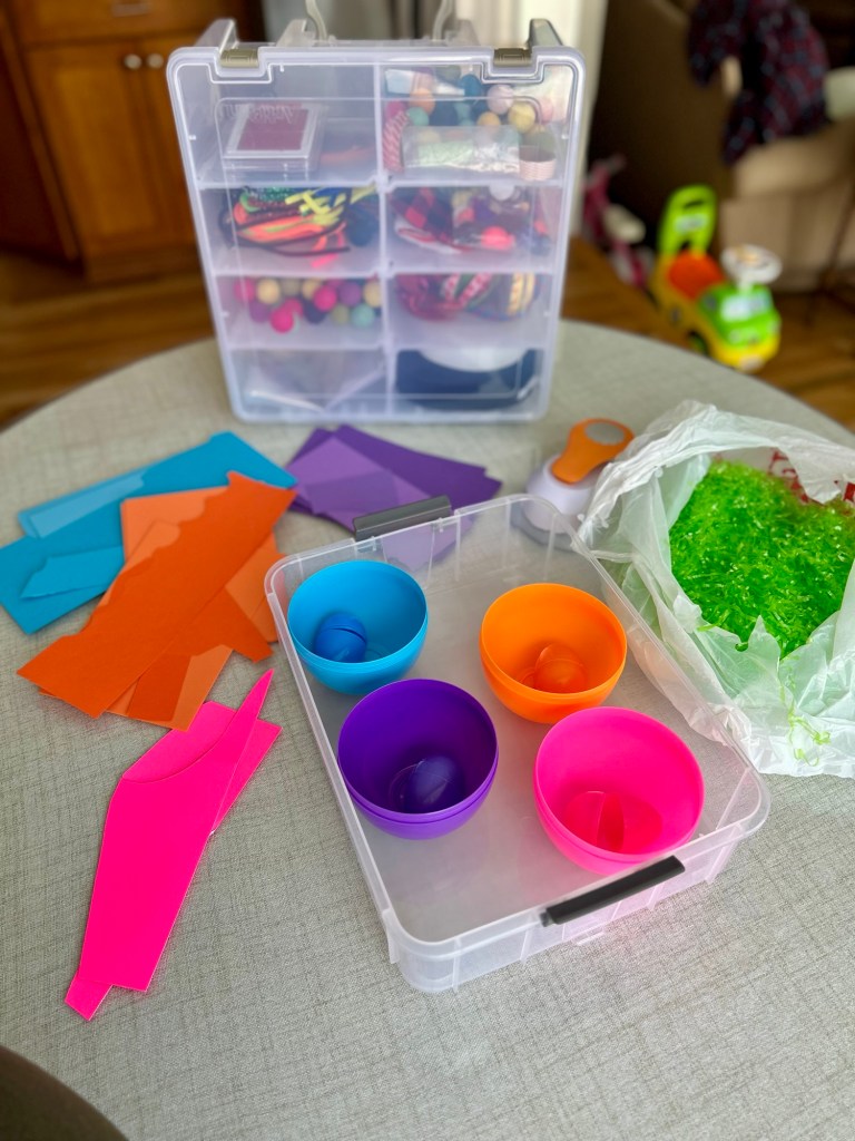 Like I’ve done with other sensory bins I’ve put together, I was determined to not buy anything and just use items I had around the house, while still making it cute and giving it a theme. I decided to make this Easter one about color matching. The colors I used were decided by the colors of jumbo Easter eggs I already had from a previous DIY project where I made dragons eggs out of them.